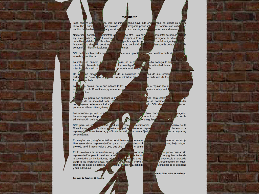 Ma fiestoTodo hom re es do libre; no impo cómo haya sido eng rado, es, desde su p r inicio, libr Nadie gún pretexto, p arrogarse poder so ro hombre, aun cuan o nacido. La ibertad nal y no alca n excusa ninguna a más que a sí mismo. Nadie tie derecho ministrar la de otro. Este prin damental es primer la ley, la cos mbre, la ituciones o dad por tanto nad arrogarse la admin ón de la liber d del ot El hombre l jer, la mujer la d o la del amigo. As co la socied o el e do podrá co ertad del individ ierno, ni la democ la comunidad, ni las instituciones, mbres. Sólo cad nombre podra res ciar a su propi beneficio de la de n acto de p na libertad. La instit ón primera, otra, es la fa nilia conjuga la lib miembro base de la a y no obligad e la libertad de cad miembr de modo de jerarquía funci y r ria. De la ilia emer de la estruct ra e ea de sus jerarqu institu es. Estas fian l que administran la e cada uno de los form sociedad. La a norma, de la que nacerá la ley y que regulan las lil in s, es la Constitución, que será consi perior y la ley matr to otras. N ley podrá ser superior a la ción será inalter la de la sociedad toda, a se consider oder con uyente pertenece a todos l nto. Sólo ellos ación podrán modificar, alterar, derog Los individuos podrán, en u o bajo coacc inguna, hacerse representar por pecial los q n con la administración de la s as ue la regulan Sólo para los ef viab ad de creac modificación, plazo de la Constitución viduos e tarán o gados hacerse repre tercero o a represe otros terceros, y sólo de cuerdo la norma fijada en la propia ley constituyente. En ningún caso, ningún individuo podrá hacerse presentar persona que acoja libremente dicha representación, para un m efecto. N ción, bajo ningún pretexto tendrá mayor valor o peso que otra en sea e En lo relativo a la administración y gol socieda o podrá quedar sin representación, para lo cual, en la sel p entación es y gobernantes de la sociedad o sus instituciones, la cu lo a los p uyentes, la manera de elegir a los representantes, de ue ning individu epresentación en ellas, cuando los actos de éstas pu ectar s libert l, conside a principal de la sociedad y sus individuos. Movimiento Libertador 16 de MayoSan Juan de Tuculcura 23 de Junio |
